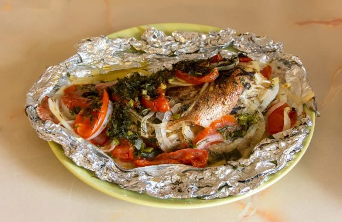 - Заверните окуня в фольгу, сделав рукав. Обязательно кусок фольги смажьте подсолнечным маслом. На середину листа выложите рыбу, а затем заверните, как конверт, чтобы во время выпекания не вытек сок.