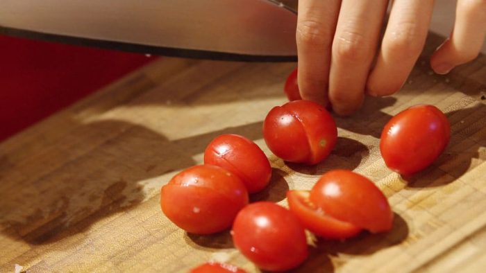 Помойте черри, разрежьте все помидоры ровно пополам.
