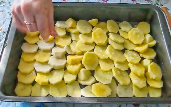 - Тонкими кусками аккуратно нарежьте картошку. Необходимо закрыть картофелем приблизительно половину формы.