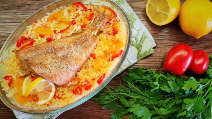 - Кусочки окуня смажьте обильно смесью, положите поверх риса.