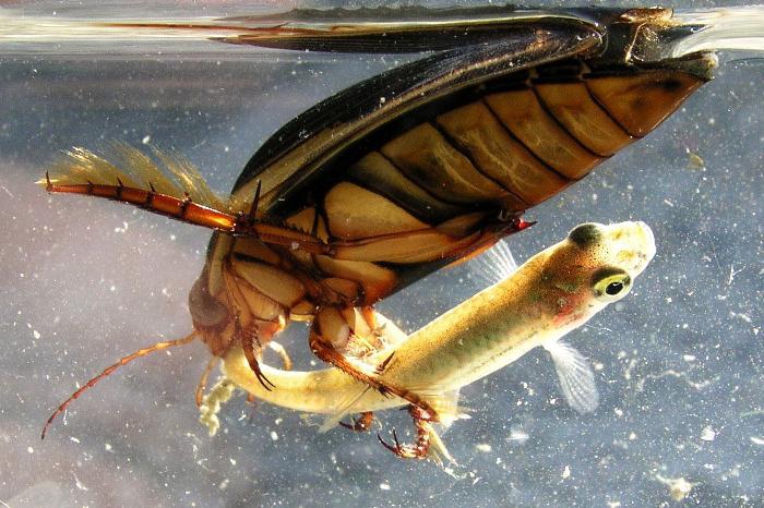 Нимфа, наяда или казарка, так еще называют личинку стрекозы, способна своими крепкими челюстями-клешнями схватить и сожрать головастика, малька. У крупных они выедают среднюю мягкую часть, мелочь глотают целиком. Взрослые рыбы с удовольствием поедают нимфу, поэтому на рыбалке она часто служит наживкой.