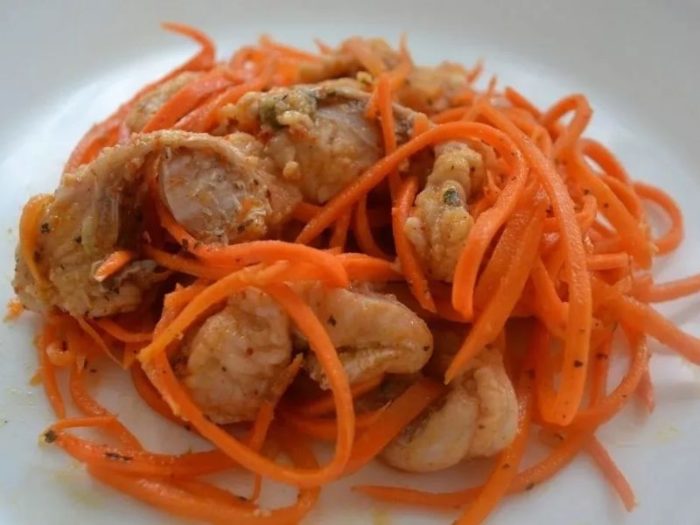 Оригинальный азиатски рецепт – это рыба с пряными овощами. Она получается одновременно сочная и пикантная за счет соков из моркови и лука.