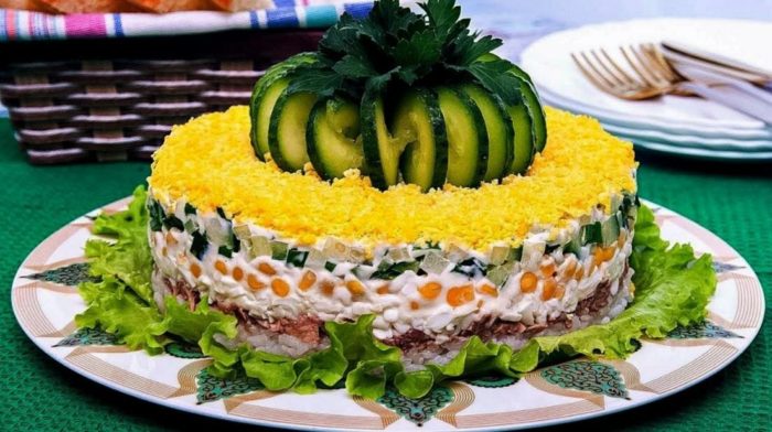 - После чего собрать салат в следующей последовательности – рыба, майонез, отварные рубленые яйца, слой майонеза, орех, морковь, слой майонеза, укроп, майонез и тертый сыр.