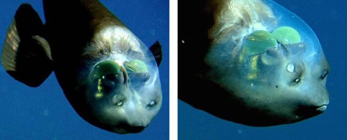 Этот житель морских глубин обитает у восточного побережья России. Отличительная особенность – прозрачная голова, внутри которой спрятаны ярко-зеленые глаза. Таким образом орган зрения надежно защищен от повреждений. По форме глаза рыбы напоминают цилиндры и направлены вертикально вверх, выслеживая добычу. Как только цель намечена, бочкоглаз делает рывок, перемещаясь наверх. При этом мускулы разворачивают глаза в горизонтальное положение, и добыча остается в поле зрения.