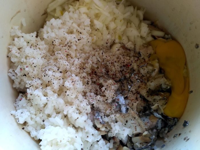 - Из рыбы, яйца и хлеба замешиваем фарш. Его нужно немного посолить.