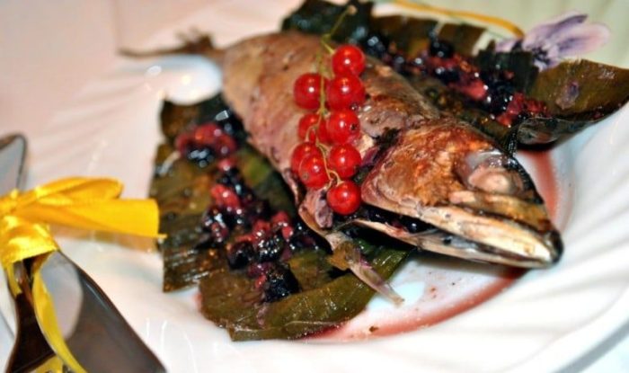 Скумбрию промыть и выпотрошить, удалить все ненужные косточки, голову для этого рецепта можно оставить. Смородину промыть, удалить веточки и всевозможные листики. Смешать ее с мелко нарезанной зеленью.