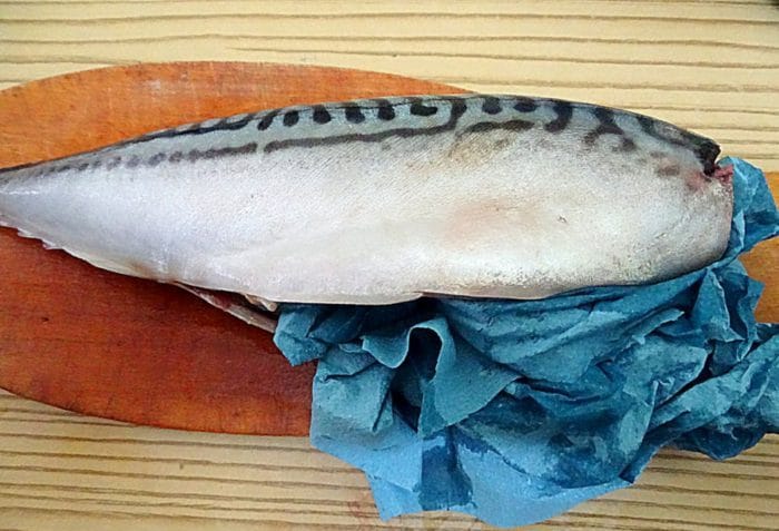Размораживать скумбрию надо постепенно в помещении. Потом распотрошить, достать внутренности, убрать хвост, голову, плавники, тщательно помыть и обтереть бумажным полотенцем.