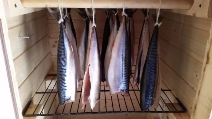 Внутри коптилки есть перекладины, на которые подвешивается скумбрия. Плотно размещать не нужно, дым должен окутывать каждую рыбешку со всех сторон, расстояние оставить пять сантиметров.