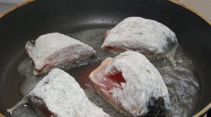 На сковороде разогреваем масло, выкладываем туда рыбу.