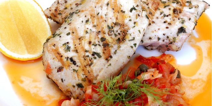 - После запекаем пеламиду на гриле с небольшим жаром, непрерывно смазывая её розмариновой веточкой обмакнутой в оливковое масло. На полную прожарку уходит примерно 15 минут.