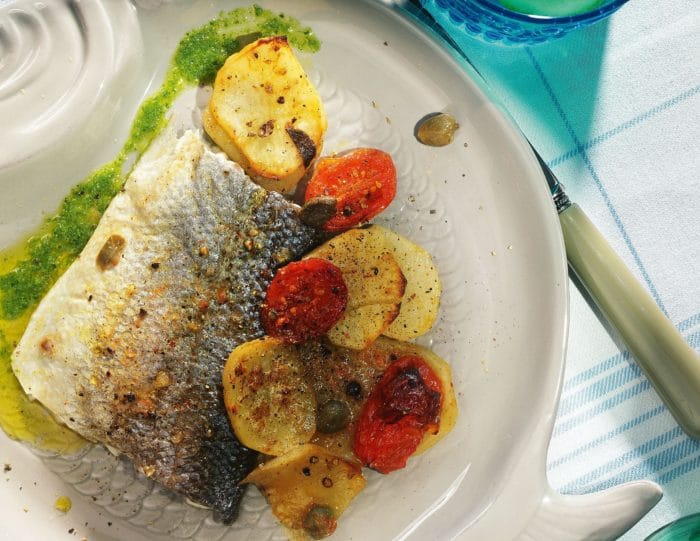 Получится очень вкусный маринад, которым следует натереть рыбу и расположить ее поверх картошки и томатов и всё отправить в духовку на 10 минут. Потом перевернуть сибаса и отправить печься еще на 10 минут. Подавать на стол с кусочками лимона.
