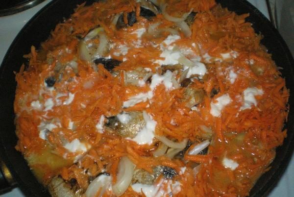 - Рыбный продукт немного обжарить в масле, затем убрать ее на тарелку и обжарить морковь.