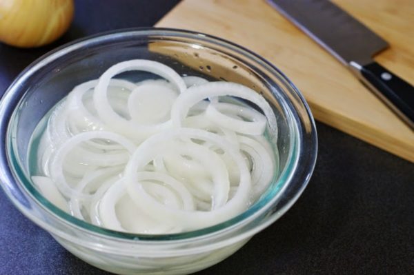 Лук необходимо почистить и нарезать кольцами, чтоб в процессе маринования он отдавал свой сок рыбке.