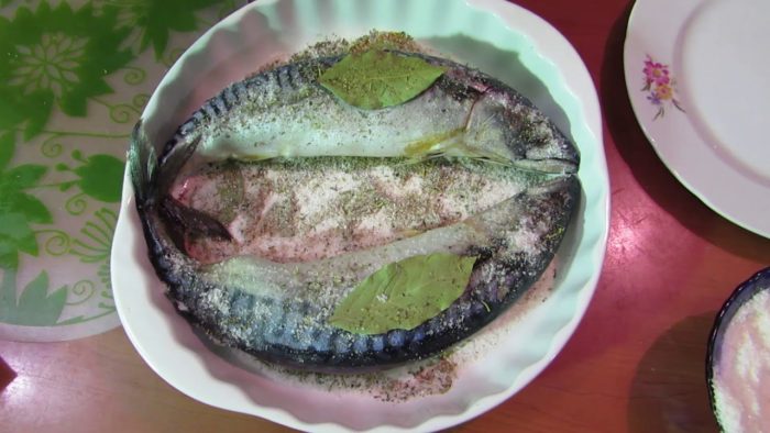 - Выкладываем чищеную скумбрию на пленку, и обтираем ее приготовленными специями. Важно качественно солить тушку, чтоб она пропиталась со всех сторон.