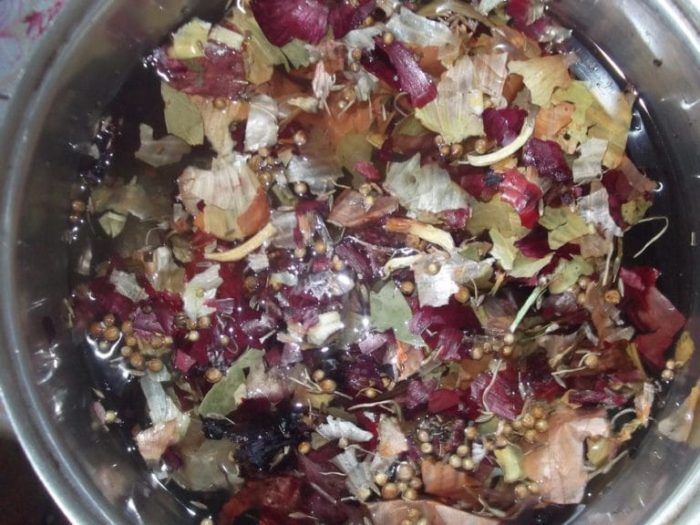 - Приготовление рассола. В литр кипятка засыпается луковая шелуха и кипятится в течение 5 минут. Жидкость процеживается, шелуха удаляется. Добавляются пакетики с чайной заваркой, соль, сахар, специи и всё кипятится 7 минут.