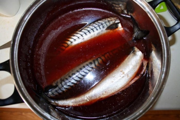 - Сварить рассол по рецепту №1 и засолить скумбрию.
