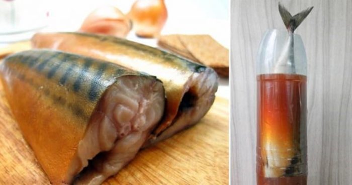 - Затем нужно взять полутора литровую пластмассовую бутылку из-под газированной воды и срезать её верхнюю часть с горлышком. Тушки скумбрии загружаются в полученную ёмкость вертикально головами вниз и заливаются приготовленным рассолом. Важно, чтобы он не был горячим, иначе рыба может стать варёной. Мариноваться в холодильнике тушки должны в течение трёх суток.