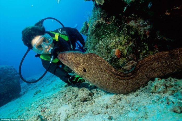 Угорь – хищник, способный передвигаться на большие расстояния, некоторые из которых он может преодолеть и по суше. Тело угря вытянутое, чуть приплюснутое по бокам. Из-за такого строения его часто путают с морской змеей, в чем можно убедиться, посмотрев на фото.