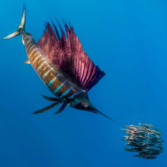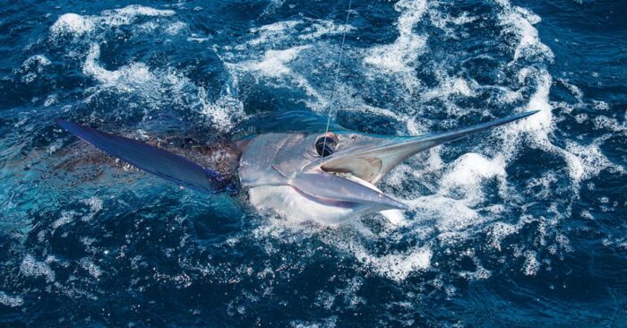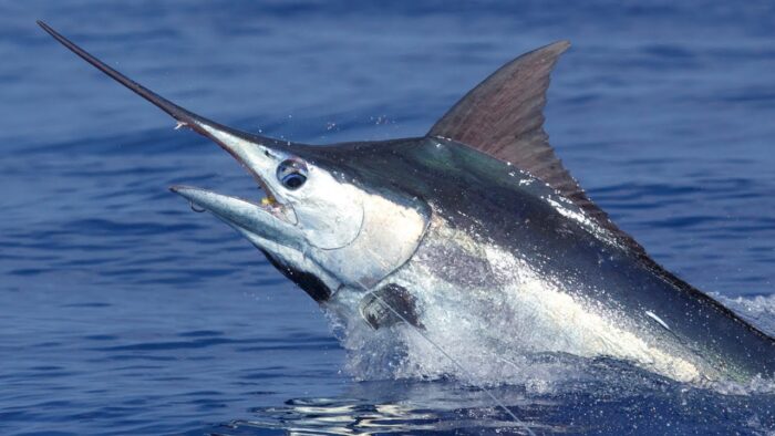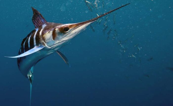 Марлин рыба, применяющая необычную тактику на охоте: разгоняется и на огромной скорости врезается в стаю, протыкая или оглушая добычу.