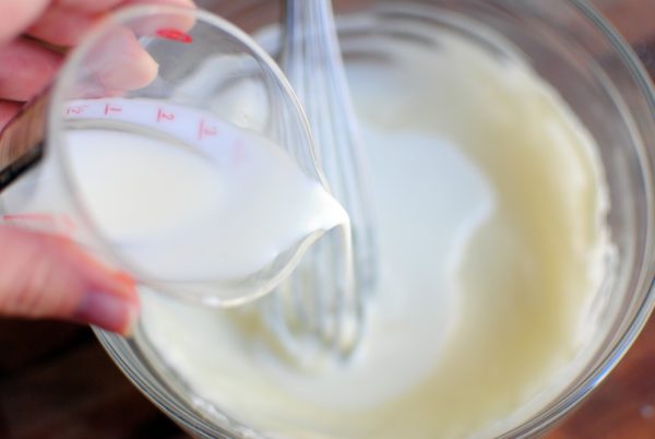 В одном стакане свежесквашенного кефира нужно развести майонез. Взбить вилкой 3 яйца, добавить к кефиру и тщательно перемешать.