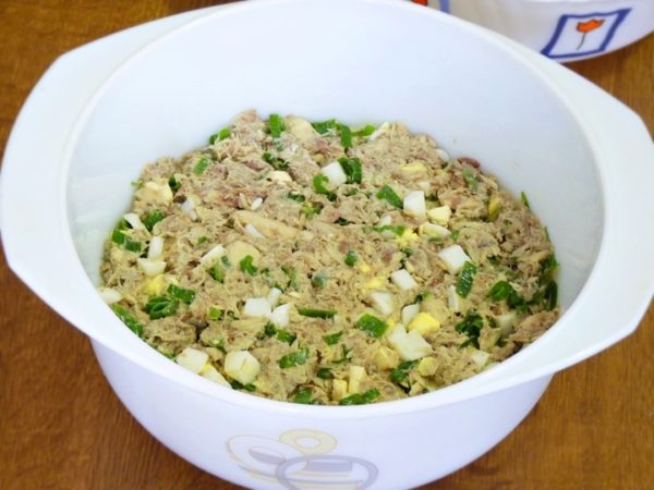 Для начинки одну среднюю луковицу почистить и мелко нарубить, из консервированной сайры удалить масло и размять вилкой. Измельчить зелень и 2 отварных яйца, смешать все ингредиенты.