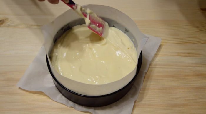 Форму для запекания смазать маслом, чтобы исключить вариант подгорания. Выложить половину подготовленной основы для пирога и равномерно распределить по нему начинку. Залить все оставшимся тестом.