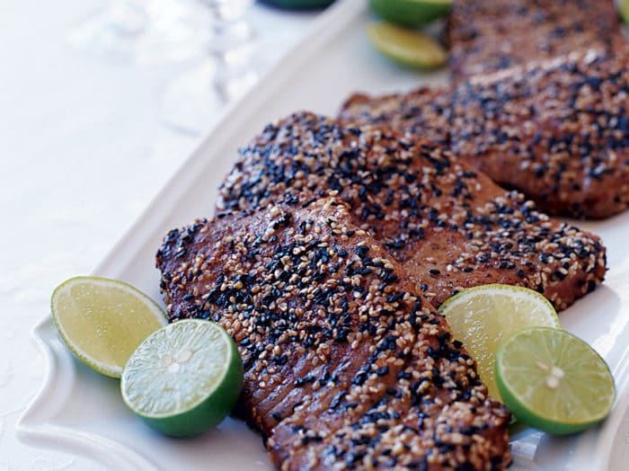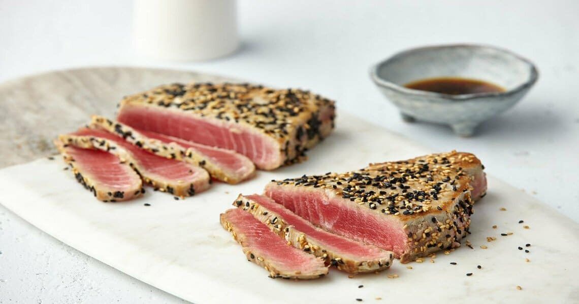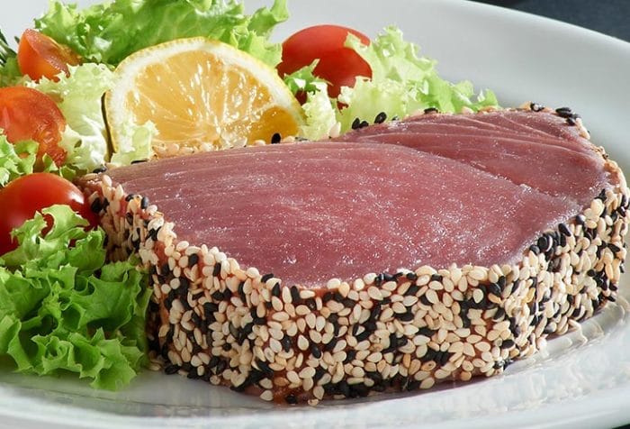 Тунец красиво смотрится на разрезе, кунжут приятно похрустывает, а сочная сердцевинка тает во рту.