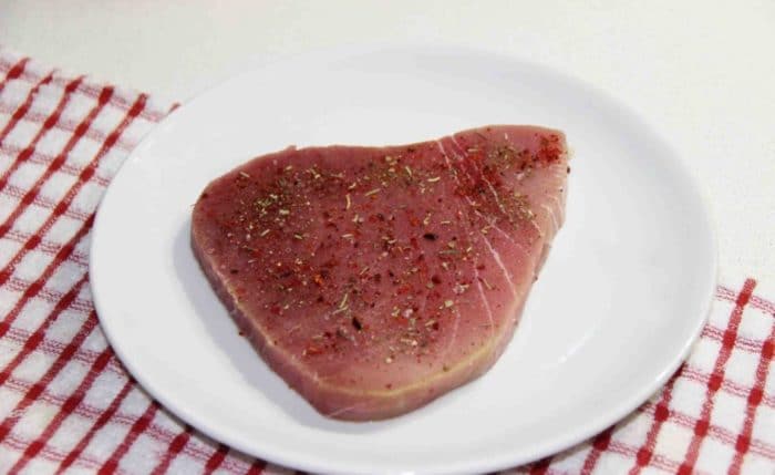 Тунец. Оливковое масло. Чуть-чуть соли. Ну и по вкусу (не обязательно) — микродозы розмарина, орегано. И все, по паре минут с каждой стороны при стейке в 15-20мм.