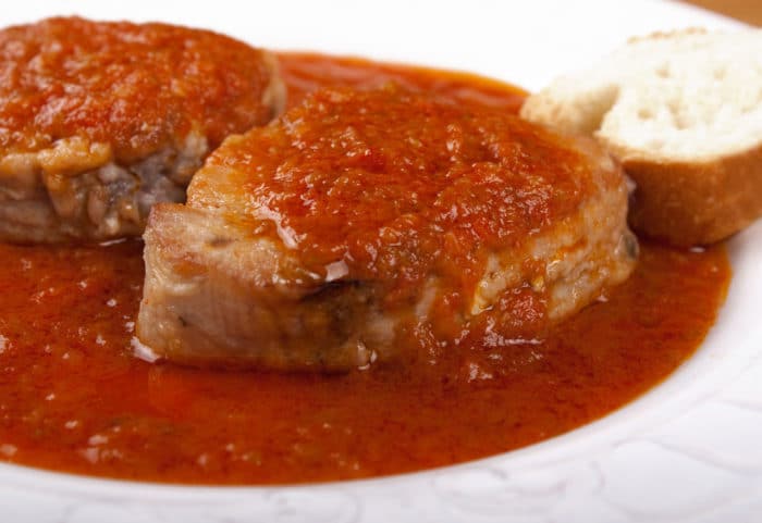 Средиземноморская кухня немыслима без рыбных блюд. Обладателям испанского темперамента понравится тунец, приготовленный с помидорами. Звучит по-испански, готовится просто, съедается быстро. Сколько бы стейков вы не готовили, всегда захочется еще.