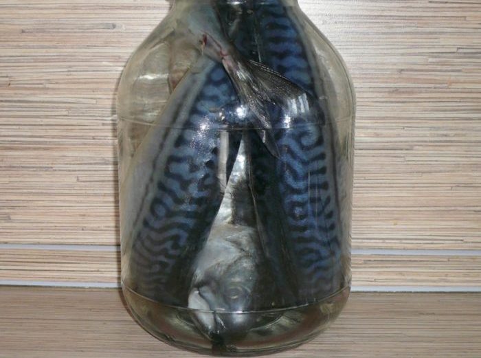 В большую емкость (подойдет 3-х литровый бутыль) укладываем плотно предварительно размороженные и выпотрошенные рыбины.