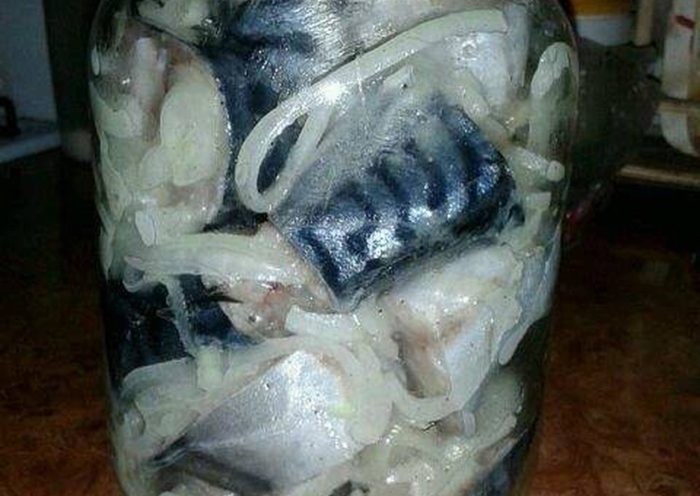 Такой рецепт засолки сокращает время подготовки, но продлевает сам процесс маринования скумбрии.