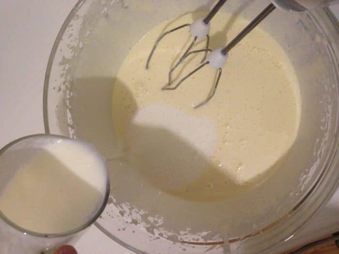Нужно взять вместительную глубокую емкость и хорошенько взбить в ней яйца при помощи миксера или венчика. Отложить.