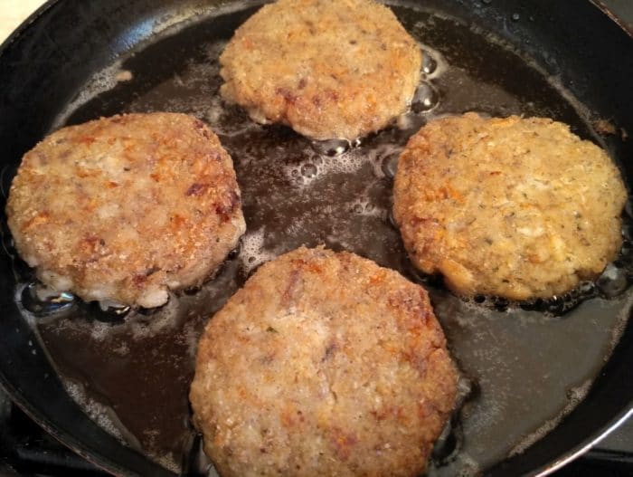 Оформить фарш в котлеты, обвалять их в муке и пожарить на растительном масле в разогретой сковороде. Котлеты следует обжаривать по 7-10 минут с обеих сторон.