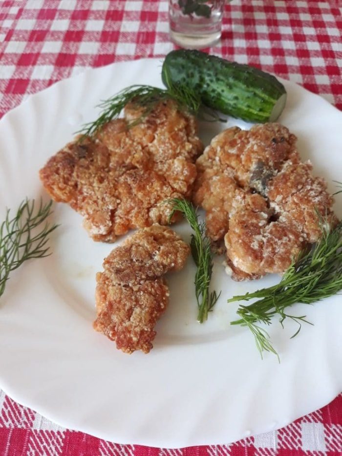 Можно использовать другой рассол: 200 мл воды + 1 ч/л уксуса. Вымачивание избавит рыбу от характерного речного запаха, который многим не нравится. После рассола рыбу следует обсушить бумажным полотенцем, нарезать на кусочки и жарить, обваливая в муке. Каждый кусочек жарить не менее 5 мин с одной стороны.