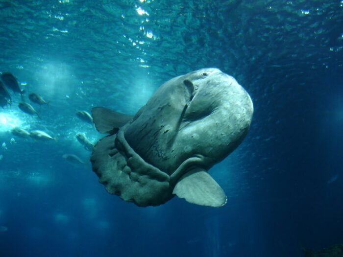 Обыкновенная рыба луна (рыба солнце, рыба голова, мола-мола) – вовсе не обыкновенная, а самая крупная и тяжелая обитательница Мирового океана. Неповоротливый костистый великан, повергающий в шок своим видом, достигает свыше двух тонн. Впечатляющий размер удивительной особи – больше четырех метров в высоту и трех метров в длину – зафиксирован в Книге рекордов Гиннеса. При пугающих габаритах мола-мола миролюбивое создание: у нее почти нет врагов.