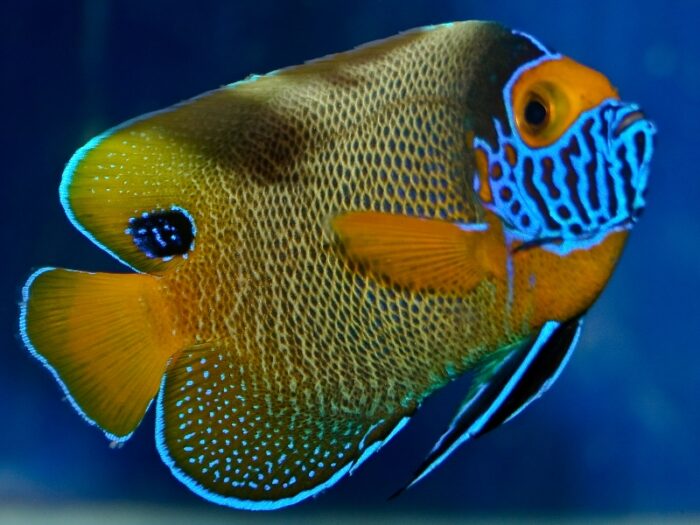 Морда у помакантуса заостренная. На фотографии можно увидеть яркую и удивительно изысканную окраску, невероятные сочетания ярких цветов – синий, красный, изумрудный, оранжевый, золотистый, лимонный, угольный. Описание этой аквариумной рыбки похоже на рыбу-бабочку. Она тоже выглядит так ярко и пестро, только у бабочки шип отсутствует.