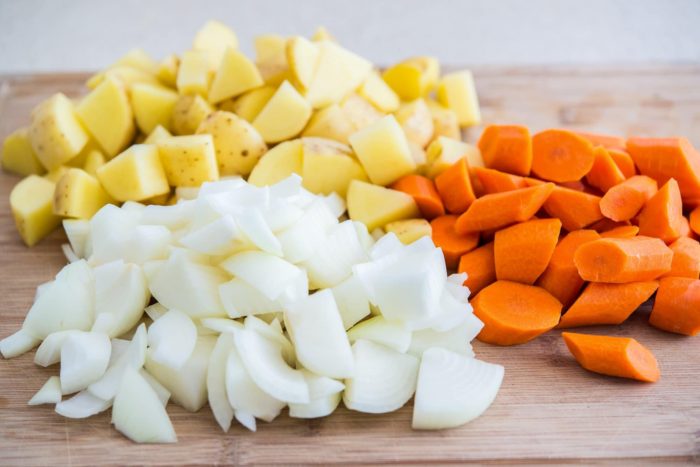 - Сладкую морковь, ароматный болгарский перец нарезать ровными кусочками. Луковицу – четвертинками.