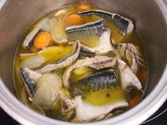 Чем больше кусочков скумбрии положить в суп, тем более ароматным и питательным он будет. Идеальная пропорция воды и рыбы 1:1. То есть на полкастрюли рыбы потребуется ровно столько же воды.
