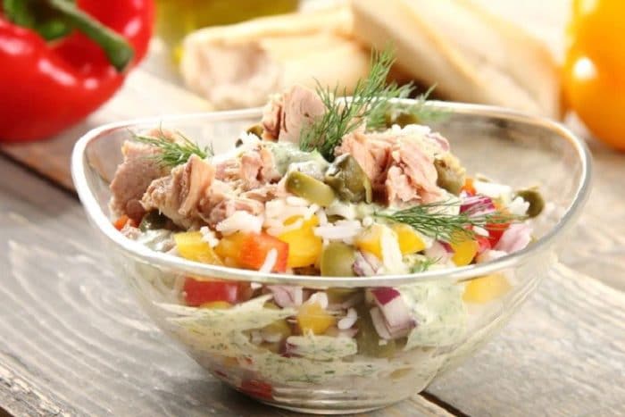 Майонез является довольно калорийным продуктом, в котором содержится большое количество жиров. Чтобы сделать салат более легким, от его применения лучше воздержаться. Выйти из положения и не оставить салат незавершенным нам поможет средиземноморская кухня, которая предлагает нам следующий рецепт салата с тунцом и рисом.