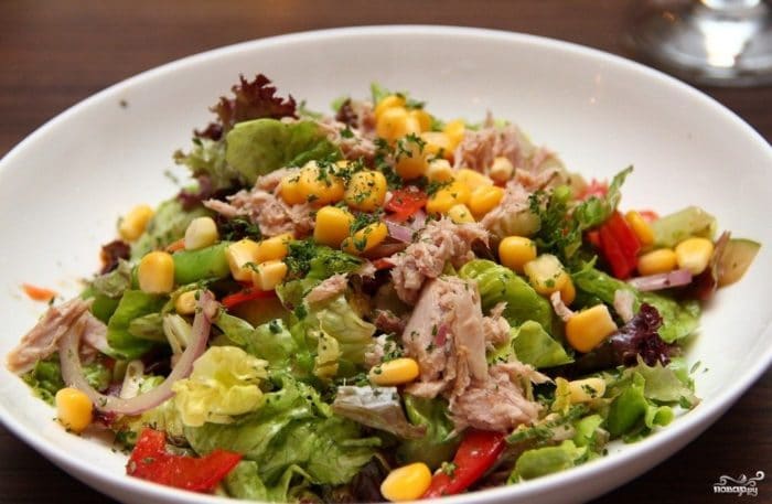 - Соединить все ингредиенты в салатнице, добавить кукурузу.