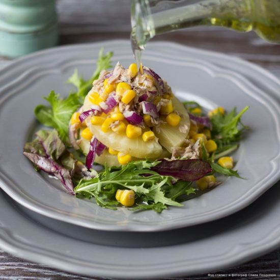 Этот салат будет чудесно смотреться на праздничном столе во время семейного торжества, и гости оценят его по достоинству. В будние дни ананас можно заменить яблоком, только придется сбрызнуть его лимонным соком, чтобы оно не потемнело в салате.