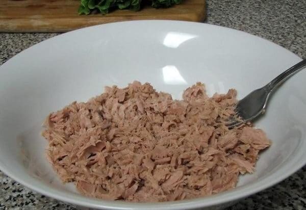 - В глубокую чашу выложить банку тунца и разобрать на небольшие волокна.