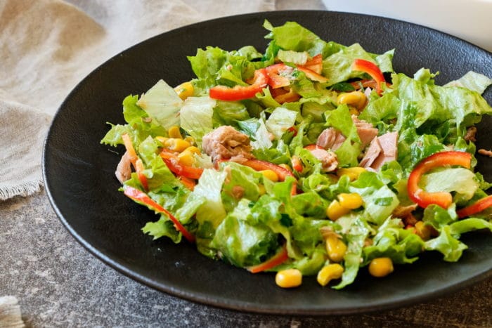 Наличие кукурузы делает салат с тунцом и капустой пикантным. В нем появляется сладкая нота, идеально комбинирующаяся с руколой.