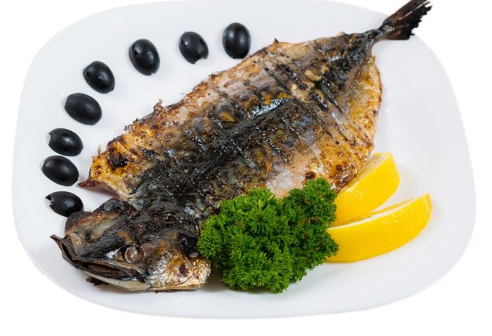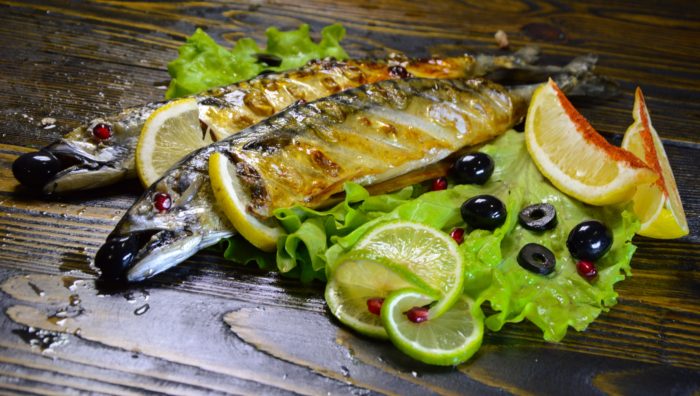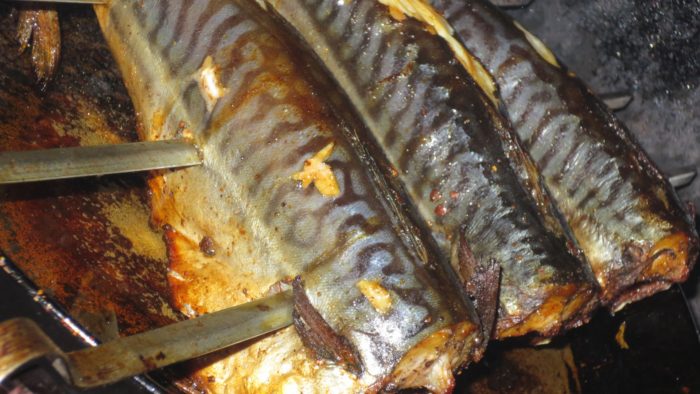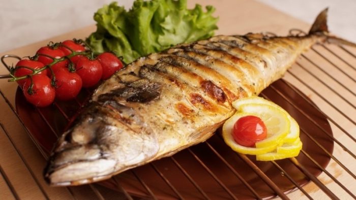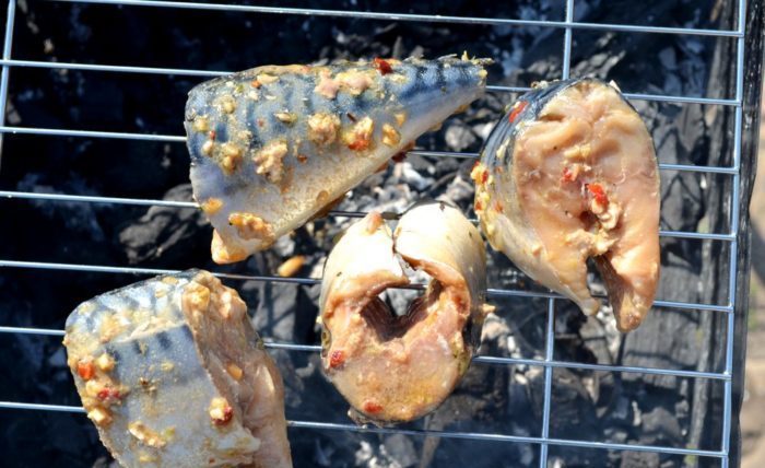 - После чего, положив ее на решетку гриль, пожарить с двух сторон, периодически переворачивая. Как только рыба покрывается корочкой и пройдет не менее 15 минут, можно снимать скумбрию с огня.