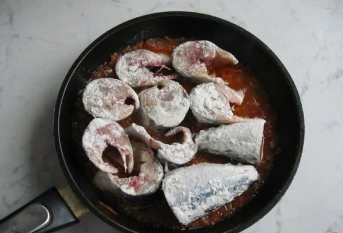 - Порезать кольцами лук, обжарить на сковороде на масле, а затем выложить на отдельную тарелку. Потом обвалять каждый кусочек рыбы в муке, отправить на сковороду с этим же маслом и обжарить до полуготовности с обеих сторон.