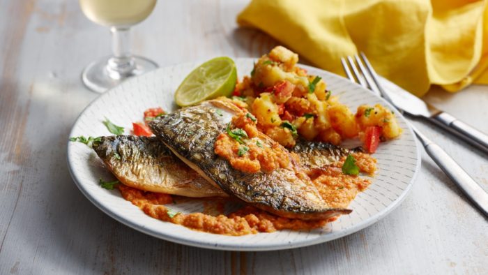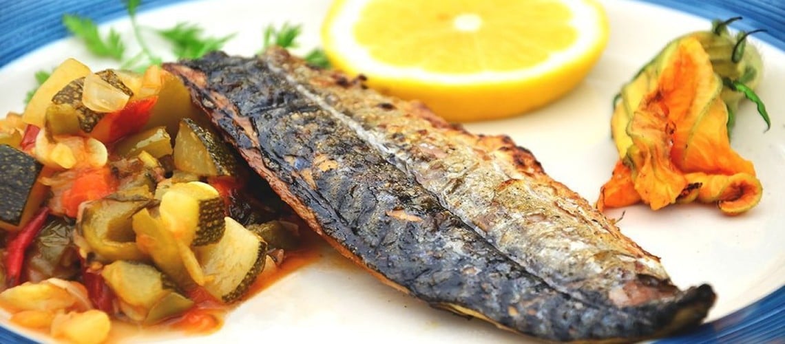 Затем несильно разогреть сковороду-гриль, добавить немного оливкового масла, выложить куски рыбы и готовить их около трех минут. Потом перевернуть скумбрию на другую сторону и продолжить в том же духе не менее трех минут.