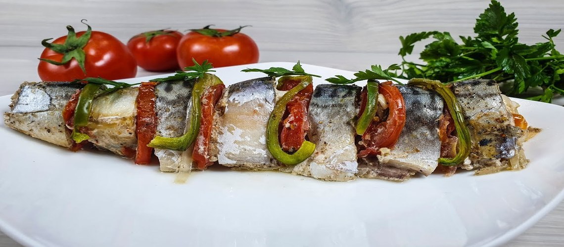Вкусной, полезной и питательной запеченная скумбрия с овощами будет, если добавить сладкий перец и баклажаны, да и внешний вид становится довольно привлекательным. Гостей это удивит, они оценят кулинарные способности хозяйки по достоинству.