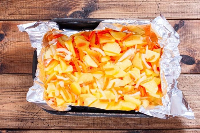 Сверху помещается рыба, предварительно выпотрошенная и вымытая. Посолить и приправить, в том числе и нижний бок, и брюхо. Щедро полить майонезом. Часть сыра положить внутрь скумбрии. А часть распределить на овощи. Сделать бортики из фольги, переложить всё на противень. Накрыть вторым листом фольги, закрепить его при помощи нижнего слоя. Духовка должна быть разогрета до 200 градусов, процесс запекания в закрытом виде длится 20 минут.