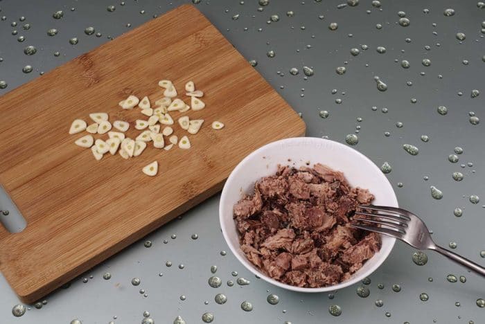 Для того, чтобы сделать пасту с тунцом, необходимо очистить и нарезать чеснок на дольки.
