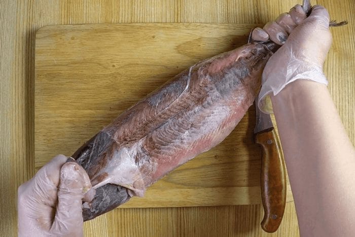 Снимите кожу — отслоите ножом со стороны хвоста и тяните в направлении головы, наматывая шкурку на нож. Теперь, уприте рыбу в досточку той частью, где была голова. Острозаточенным, желательно, тяжёлым ножом срезайте филе. Старайтесь делать движения, чтобы стружка рыбы получилась достаточно ровной и крупной.